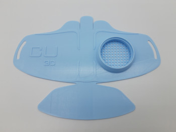 Eine erweiterte Variante der Atemschutzmaske, aus der Initiative "Hack the pandemic". Besteht aus drei Teilen: Maske, Kappe und Ventilplatte.